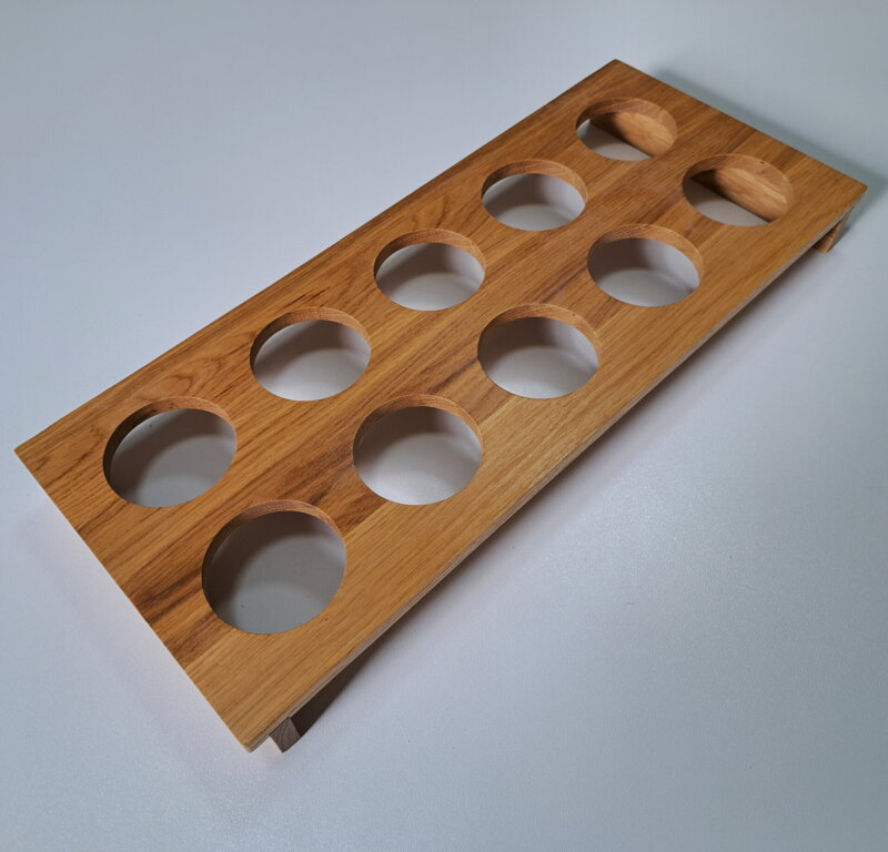 Držiak vyrobený z dubového alebo bukového dreva určený na uloženie okrúhlych koreničiek v príborníkovom systéme Univerzál.
